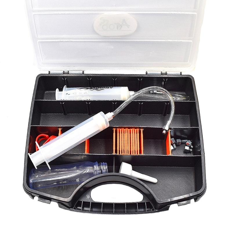 Ce kit de purge vous permet d’assurer l’entretien et le bon fonctionnement d’un système de freinage à disque hydraulique sur tous types de vélo. Ce coffret renferme tous les accessoires indispensable pour retirer et renouveler le liquide minéral de purge.