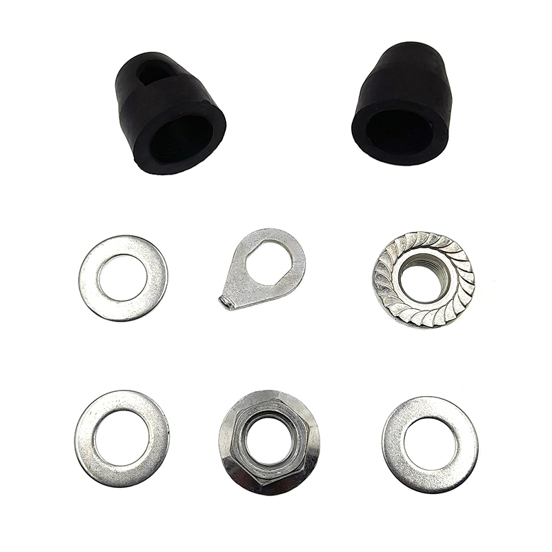 Ensemble de visserie incluant des écrous, rondelles, boulons et capuchons de protection pour roue avant.