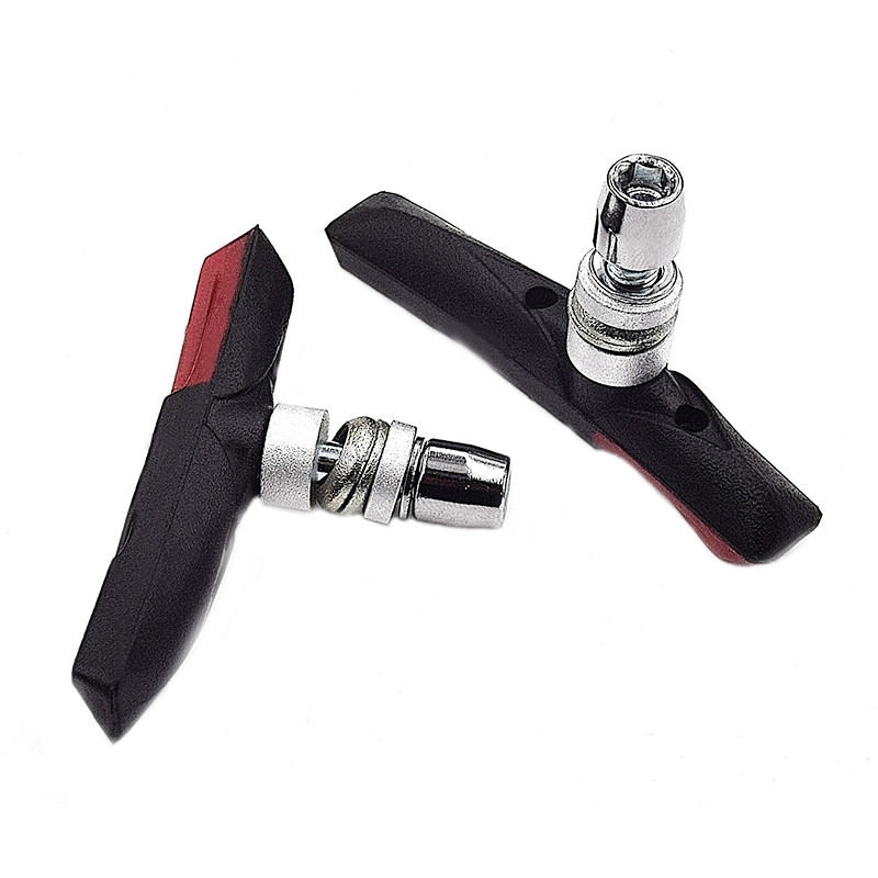 Cartonnette contenant une paire de patins de freins 72 mm haut de gamme type V-Brake avec gomme spéciale de couleurs rouge et noir pour toutes conditions Humides et sèches.