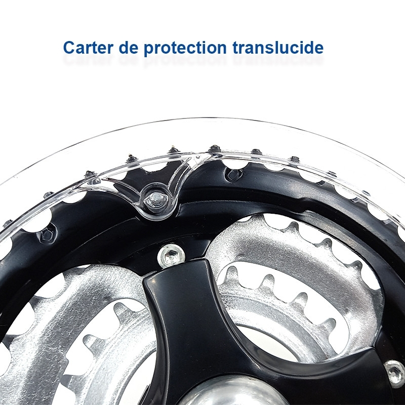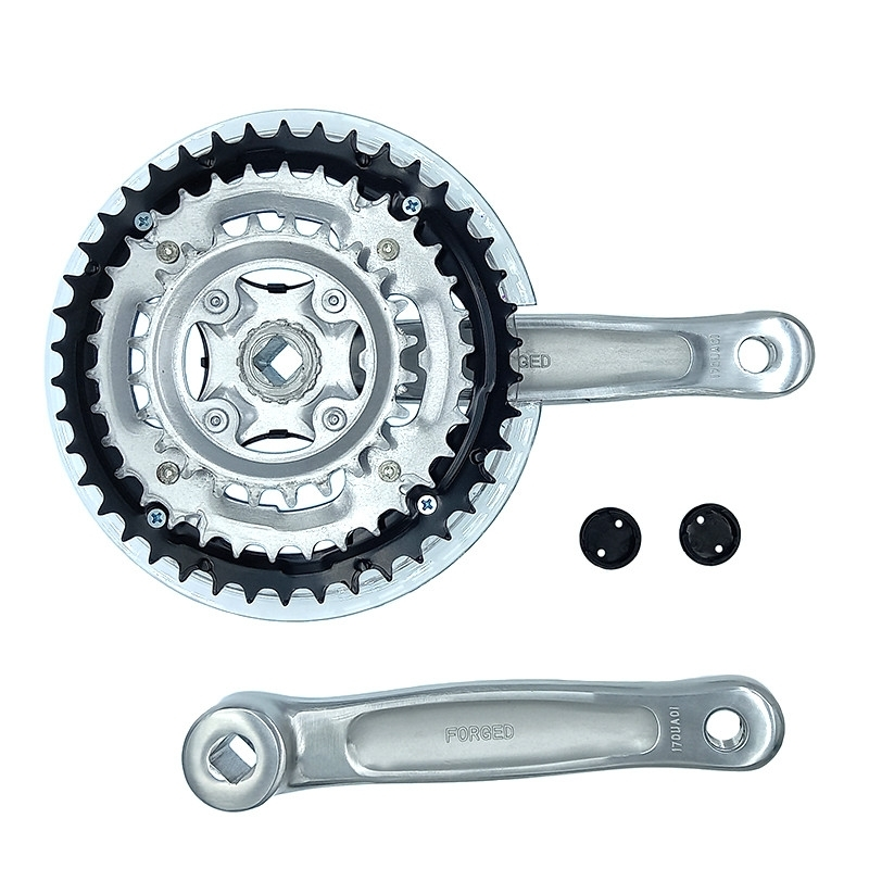 Pourvu de manivelles 170 mm et de 3 plateaux à 4 branches de 24/34/42 dents est d’un carter de protection plastique ainsi que des caches pour axe de pédalier vélo , il est prévu pour les transmissions de 7 ou 8 vitesses en 1/2×3/32