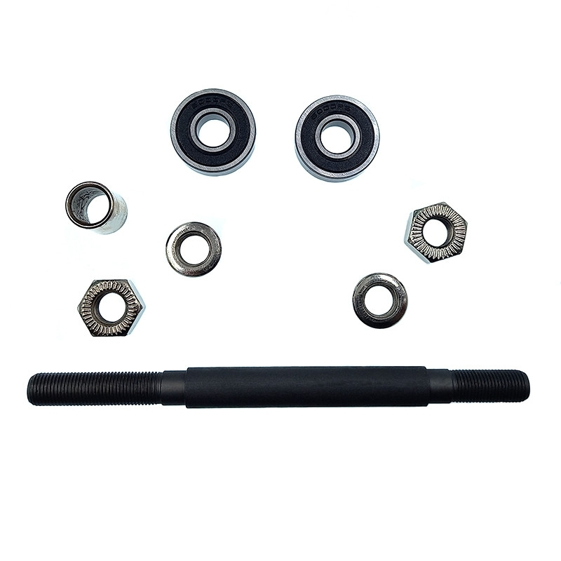 L’axe est fourni avec 2 rondelles, 2 écrous et 1 entretoise ainsi que 2 roulements 6000 RS pour assurer une bonne rotation.