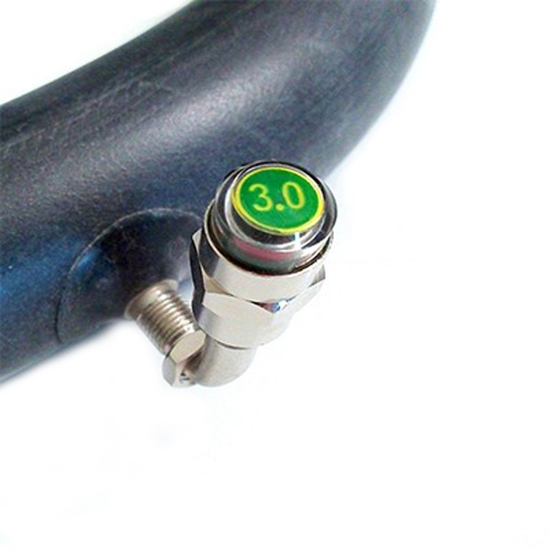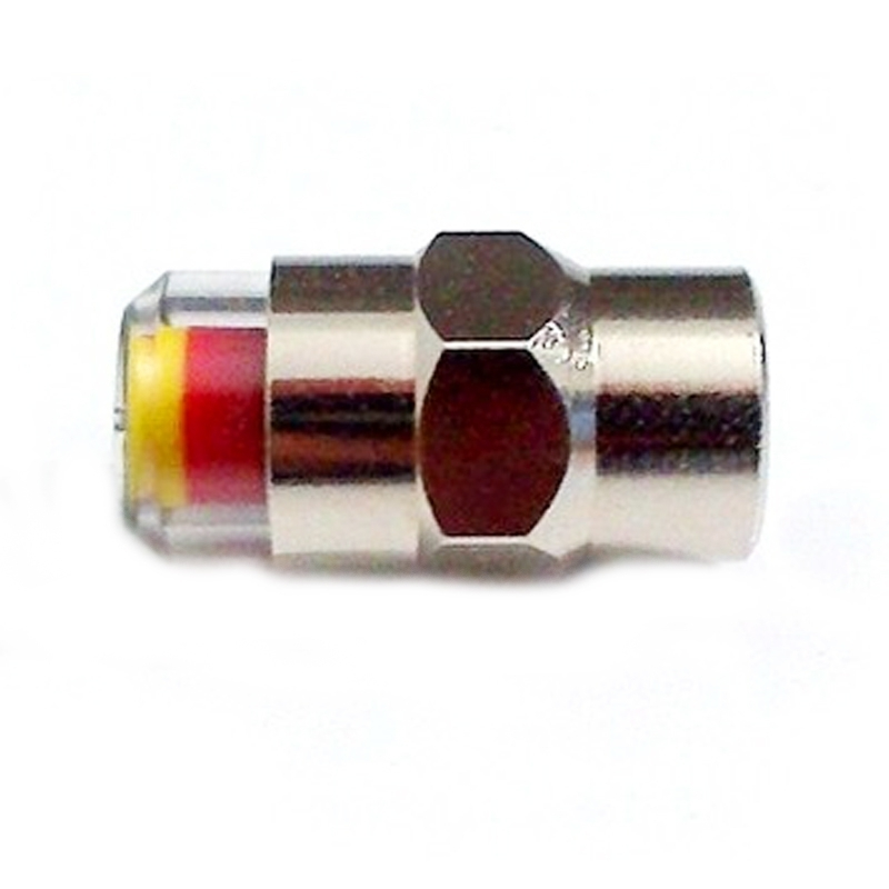Ce bouchon de valve Schräder (grosse valve type AUTO) présente un indicateur qui est de couleur verte lorsque la pression de gonflage est de 3 Bar. L’indicateur devient rouge lorsque la pression diminue.