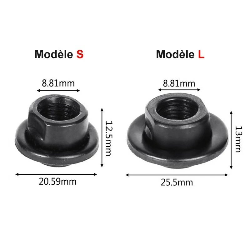 Disponible en 2 versions, l’écrou se monte sur l’axe avant (modèle S) ou sur l’axe arrière (modèle L) du vélo.